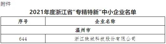 珠城科技入選浙江省專精特新企業